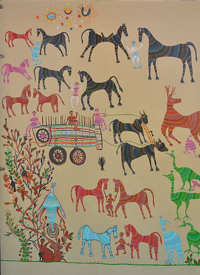 Bhil artists paint pictures of everyday characters, their ancestors, and even deities, filling them with an overlay of uniform dot patterns.